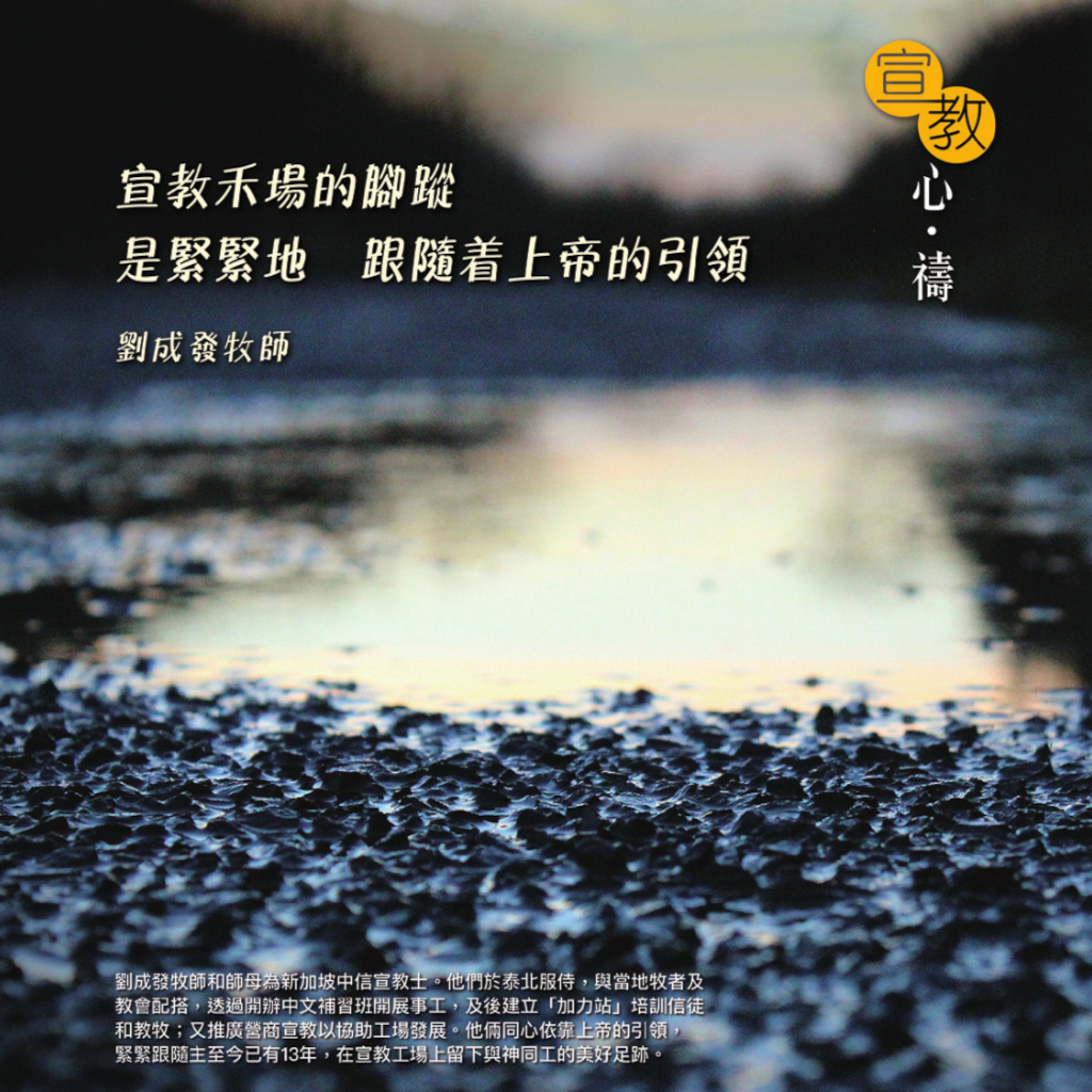 劉成發牧師和師母為新加坡中信宣教士。他們於泰北服侍,與當地牧者及教會配搭,透過開辦中文補習班開展事工,及後建立「加力站」培訓信徒和教牧;又推廣營商宣教以協助工場發展。他倆同心依靠上帝的引領,緊緊跟隨主至今已有 13 年,在宣教工場上留下與神同工的美好足跡。